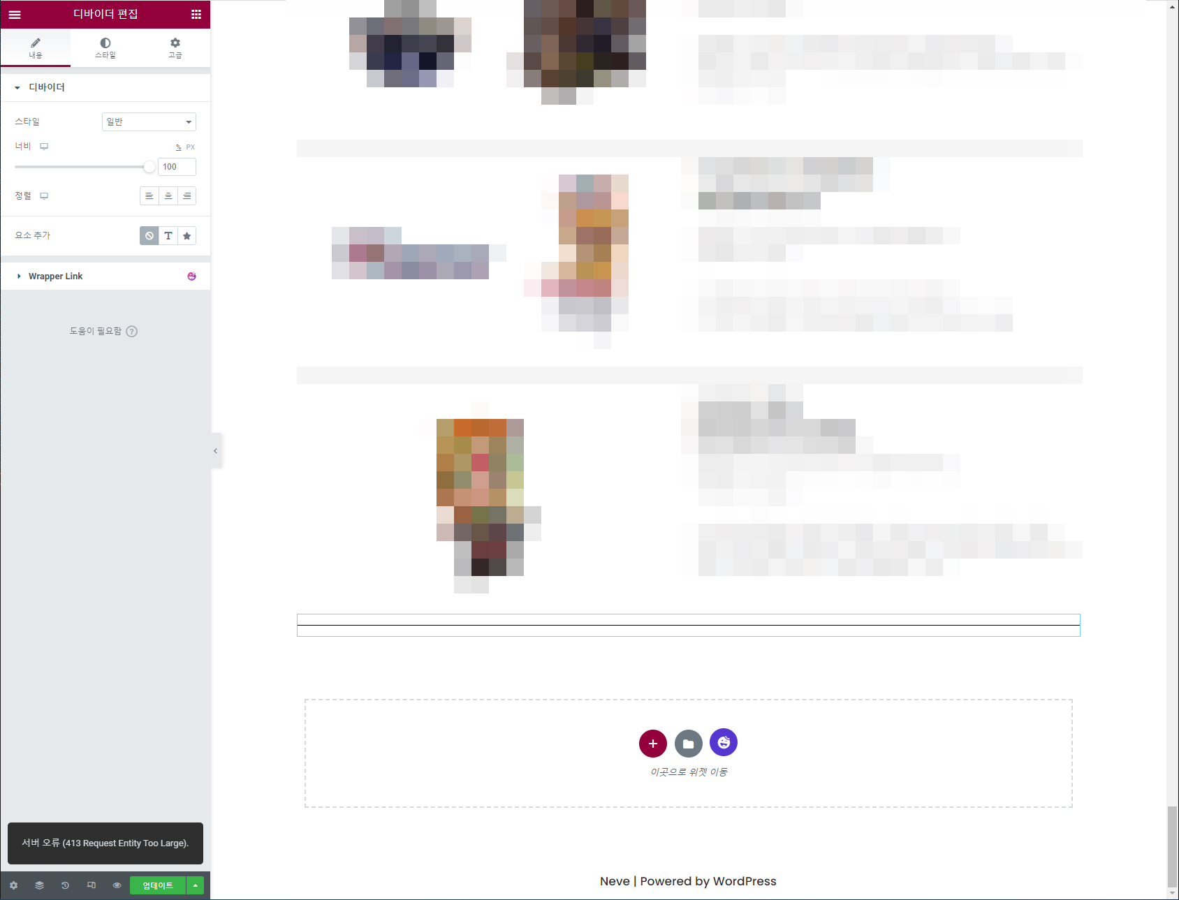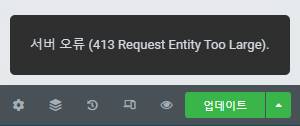 서버에 파일을 업로드 할 때 발생했다면 대게는 업로드 할 수 있는 파일 용량의 한계를 넘겼기 때문이겠지만 워드프레스로 사이트를 제작하는 도중에 '저장하기'나 '업데이트'를 눌렀을 때 발생한다면 정말 난감하다. 아래와 같은 상황이다.